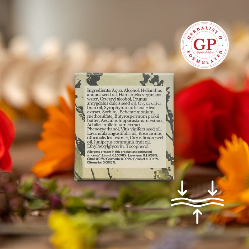 Aqua (Water), Alcohol, Sunflower Seed Oil (Helianthus annuus), Witch Hazel Water (Hamamelis virginiana), Cetearyl Alcohol, Sweet Almond Oil (Prunus amygdalus dulcis), Rice Bran Oil (Oryza sativa), Comfrey Leaf Extract (Symphytum officinale), Sorbitol, Behentrimonium Methosulfate, Shea Butter (Butyrospermum parkii), Horse Chestnut Extract (Aesculus hippocastanum), Yarrow Extract (Achillea millefolium), Phenoxyethanol, Grape Seed Oil (Vitis vinifera), Lavender Oil (Lavandula angustifolia), Rosemary Leaf Extract (Rosmarinus officinalis), Lemon Peel Oil (Citrus limon), Juniper Berry Oil (Juniperus communis), Ethylhexylglycerin, Tocopherol (Vitamin E).